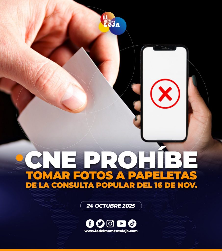 📷🚫🗳️¡Atentos todos! El Consejo Nacional Electoral, como parte de sus disposiciones mantendrá la prohibición de uso de “dispositivos móviles, eléctricos y/o electrónicos durante el acto del sufragio en las juntas receptoras del voto”, en el referéndum y consulta popular 2025, programadas para el próximo 16 de noviembre. Aquellos que incumplan esta medida podrán enfrentar un proceso judicial en el Tribunal Contencioso Electoral (TCE) por incurrir en una infracción electoral grave, tipificada en el artículo 279 del Código de la Democracia, numeral 12, por “incumplir las resoluciones del CNE y del TCE”. Esto se sanciona con el pago de 11 salarios básicos unificados y un año de suspensión de los derechos políticos.