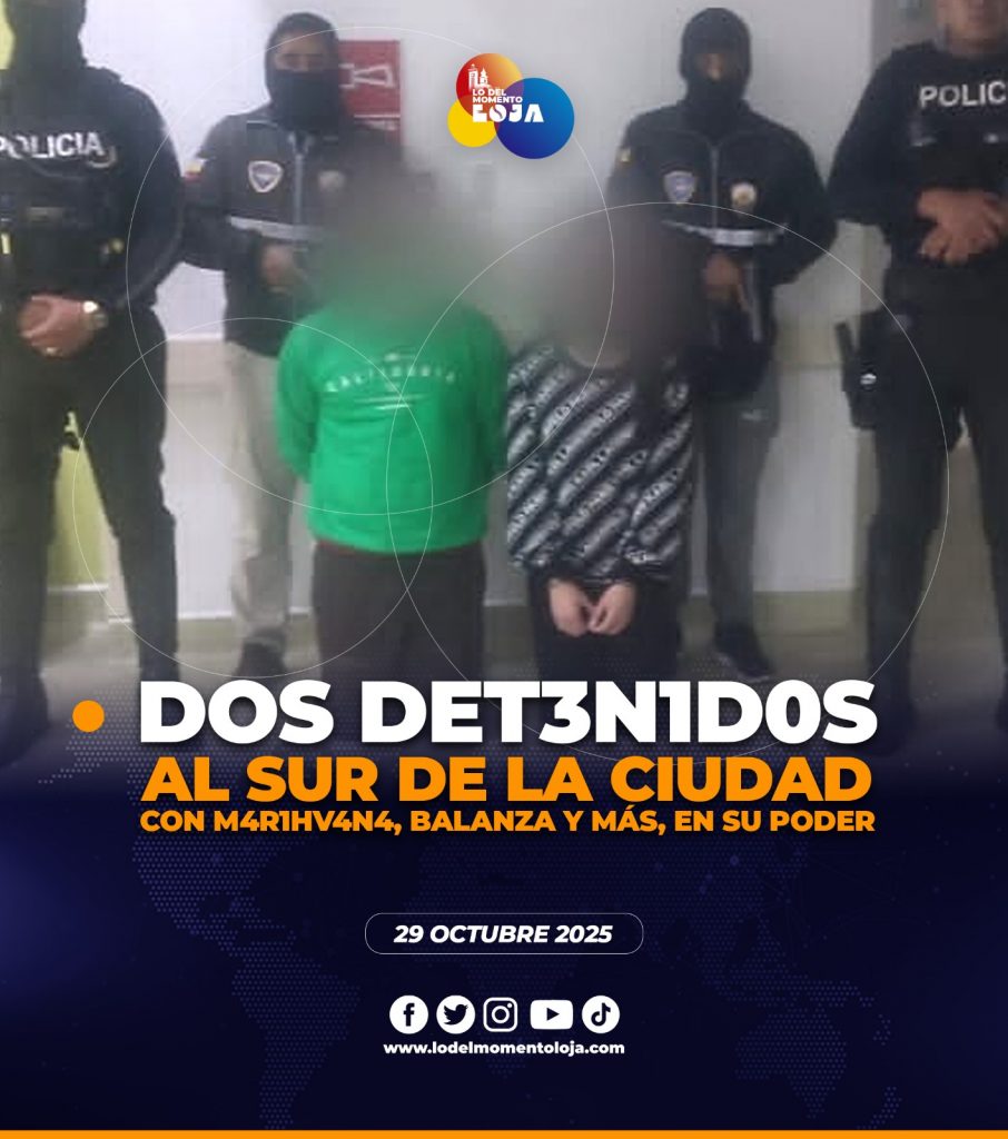 😱🚨🚔¡Dos detenidos! La Policía Nacional del Ecuador, a través de la Jefatura Antinarcóticos, aprehendió a dos personas en un operativo ejecutado en la ciudadela Esteban Godoy, al sur de Loja, por el presunto d3l1to de tráfico para consumo interno. En el allanamiento al inmueble donde residían, se lograron decomisar un total de 724 gramos de mar1hv4na, equivalente a unas 1.448 dosis, además de una balanza digital, un celular y materiales para el empaque.