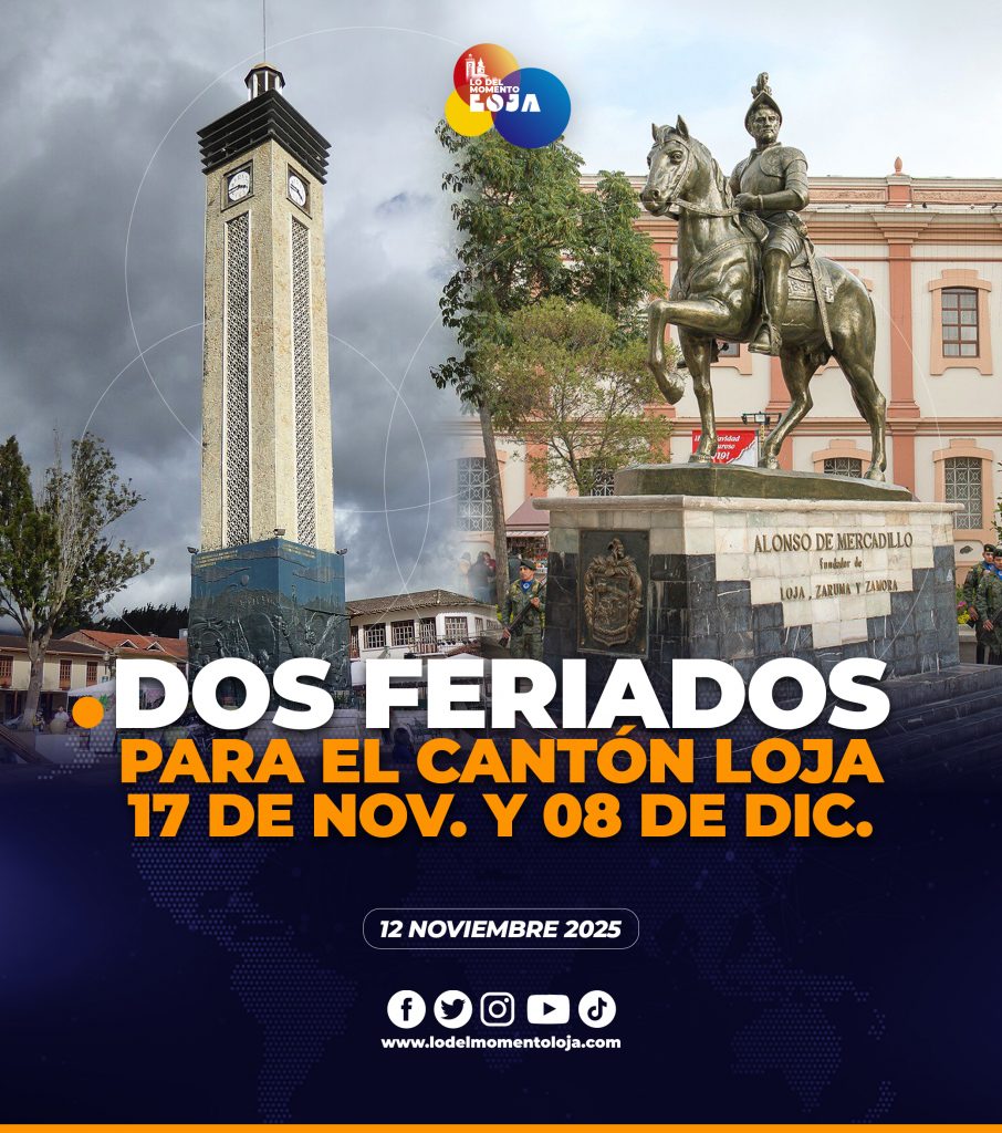 🤩🧳🏖️ ¡Antes de Navidad! El cantón Loja tendrá un acontecimiento bastante particular, ya que contará con dos feriados puente en menos de 30 días o antes de la Navidad; estas fechas estarían relacionadas con el 17 de noviembre por los 205 años de Independencia (1820) y el 8 de diciembre (1548) por los 477 años de fundación, puesto que ambas fechas conmemorativas coinciden el día lunes, por lo que los ciudadanos alargarían sus fines de semana con el puente del lunes y retornarían a sus labores cotidianas el martes subsiguiente.
