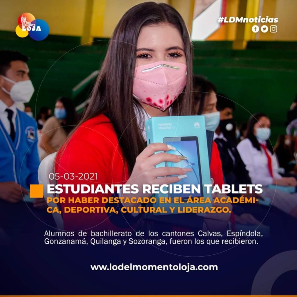 Desde la ciudad de Cariamanga, por parte de la Prefectura de Loja, alumnos de bachillerato que han sido destacados en el área académica, deportiva, cultural y liderazgo de los cantones Calvas, Espíndola, Gonzanamá, Quilanga y Sozoranga, recibieron una tablets, una acción que fue orientada para reconocer el esfuerzo y empeño de los jóvenes de los terceros años.