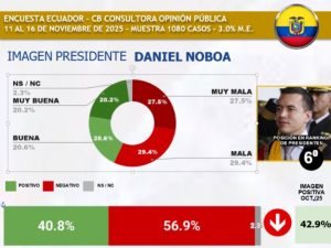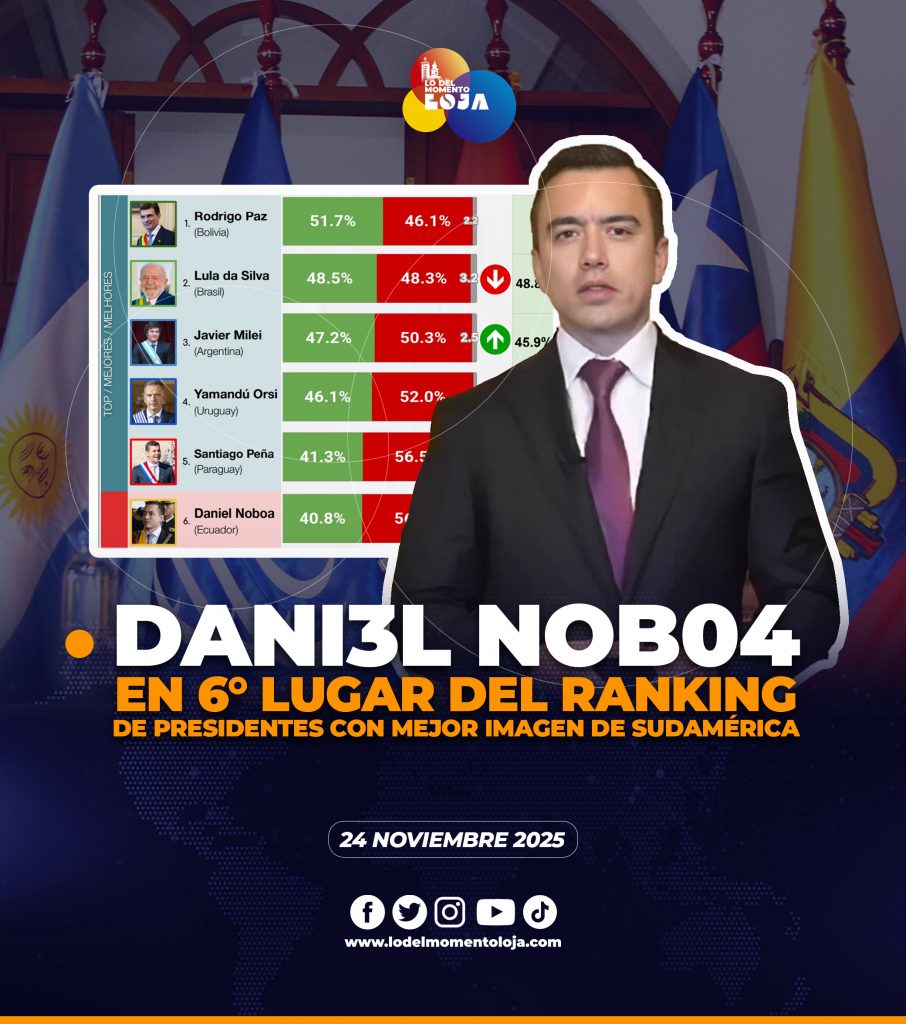 El primer mandatario ecuatoriano Dan13l Nob04 descendió al sexto puesto del ranking de presidentes de América del Sur con mejor imagen positiva, de acuerdo con el informe de noviembre de 2025 elaborado por la empresa argentina CB Consultora Opinión Pública.