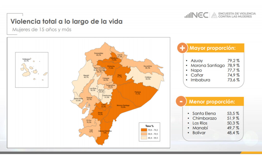 A lo largo de la vida, las provincias con mayor proporción de violencia a la mujer son Azuay 79,2%, Mora Santiago 78,9%, Napo 77,7%, Cañar 74,9% e Imbabura 73,6%; mientras que las provincias de menor proporción son Santa Elena 53,5%, Chimborazo 51,9%, Los Ríos 50,3%, Manabí 49,7% y Bolívar en 48,4%.