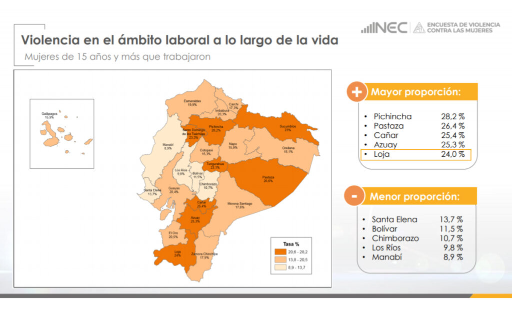 El primer dato que alarma, es ver la posición y porcentaje con el que cuenta la provincia de Loja, con respecto a la violencia a la mujer en el ámbito laboral a lo largo de su vida, escalando en la posición número 5 con las provincia de mayor proporción, solo por debajo de Pichincha 28,2%, Pastaza 26,4%, Cañar 25,4%, Azuay 25,3% y Loja con el 24,0%.