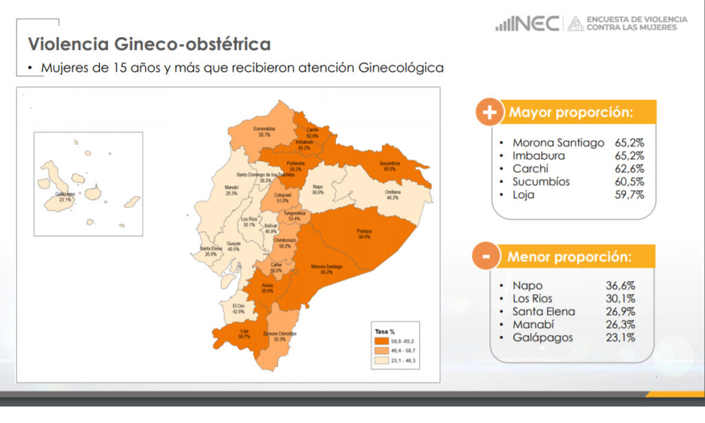 El segundo dato que alarma, nuevamente ubica a la provincia de Loja, con respecto a la violencia que recibieron en atención Ginecológica, escalando en la posición número 5 con las provincia de mayor proporción, solo por debajo de Morona Santiago 65,2%, Imbabura 65,2%, Carchi 62,6%, Sucumbíos 60,5% y Loja con el 59,7%.