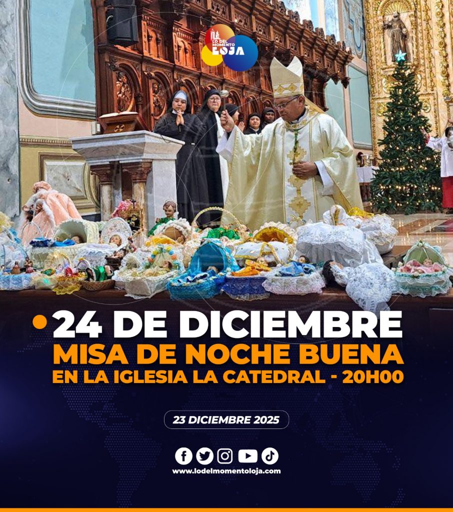 ⛪👼🏻🎅🏻¡Noche especial! En la Iglesia Catedral de la ciudad de Loja, este 24 de diciembre, a partir de las 20h00, se celebrará la Misa de Nochebuena, una de las ceremonias más significativas de la Navidad. Durante la eucaristía, las familias podrán llevar la imagen del Niño Jesús para recibir su bendición, fortaleciendo así la fe y la unión familiar. Asimismo, los templos católicos de la ciudad exhiben nacimientos navideños elaborados con gran creatividad, muchos de ellos utilizando materiales reciclables. Estas representaciones resaltan el mensaje de esperanza, solidaridad y el verdadero significado de la Navidad, invitando a la comunidad a reflexionar y compartir en armonía.