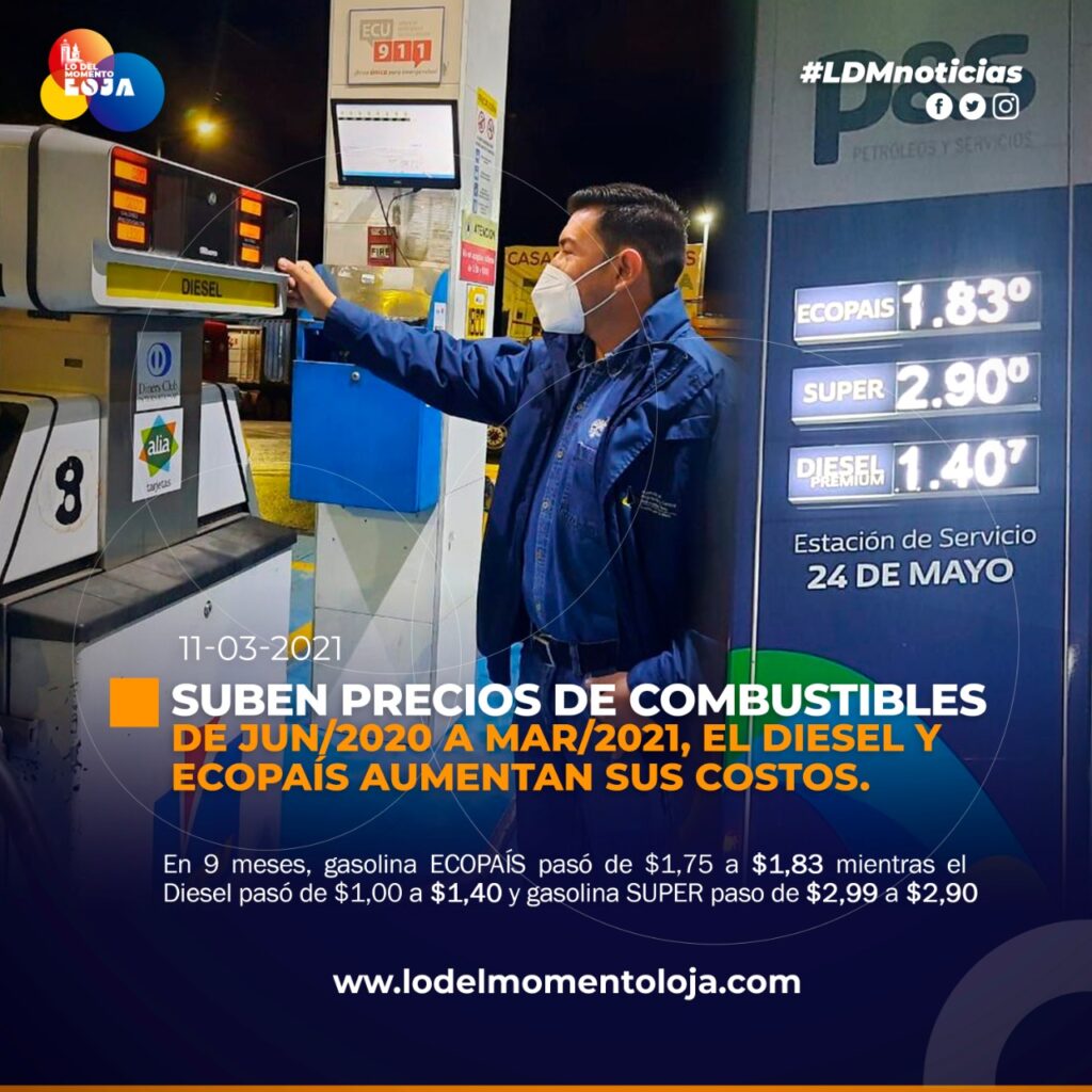 A partir de las 00h01 del 11 de marzo del 2021, se registró el noveno ajustes en el valor de los combustibles; estos ajustes se han venido dando desde junio del 2020 a marzo del 2021, sobre todo en el diésel que pasó de USD1,00 a USD1,40 dejando un incremento de $0,40 centavos de dólar por galón, mientras que la gasolina ECOPAÍS pasó de USD1,75 a USD1,83 dejando un incremento de $0,08 centavos de dólar por galón.