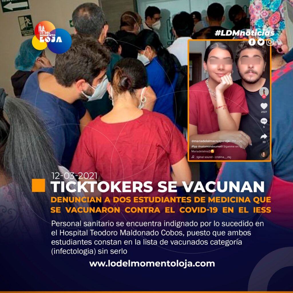 Personal sanitario indignado por lo que pasó el día de ayer 11 de marzo del presente, en el Hospital Teodoro Maldonado Carbo, denunciaron a dos estudiantes de medicina que se vacunaron en la casa de salud del IEES. Ambos jóvenes son conocidos por ser influencers de la red social TickTocker.
