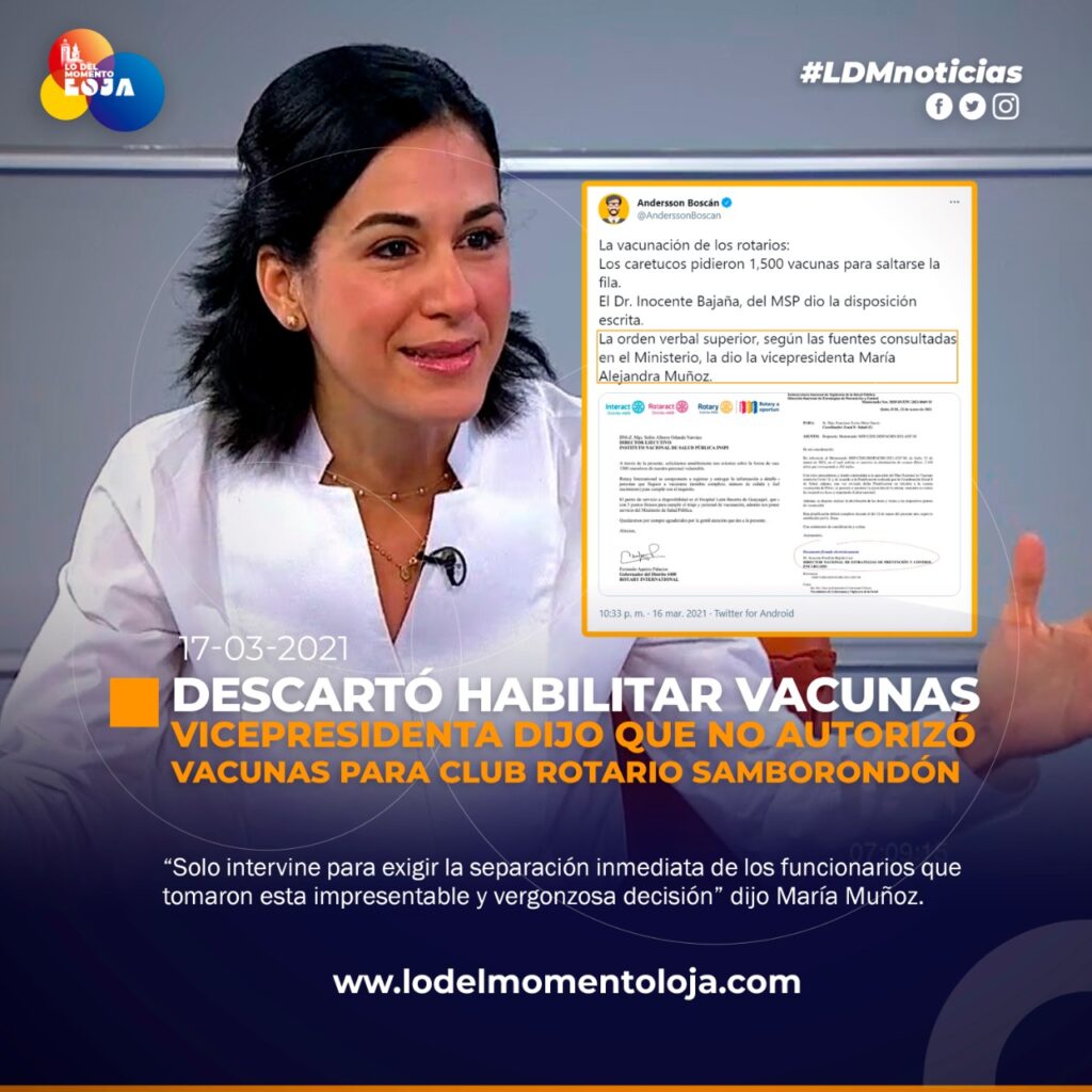 Tras la exposición pública donde el Club Rotario de Samborondón recibieron las vacunas contra el COVID-19 tras la habilitación dada por el Dr. Inocente Bajaña del MSP, las fuentes del periodista Boscán de La Posta, aseguraban que la orden verbal superior la dio la vicepresidenta María Alejandra Muñoz.