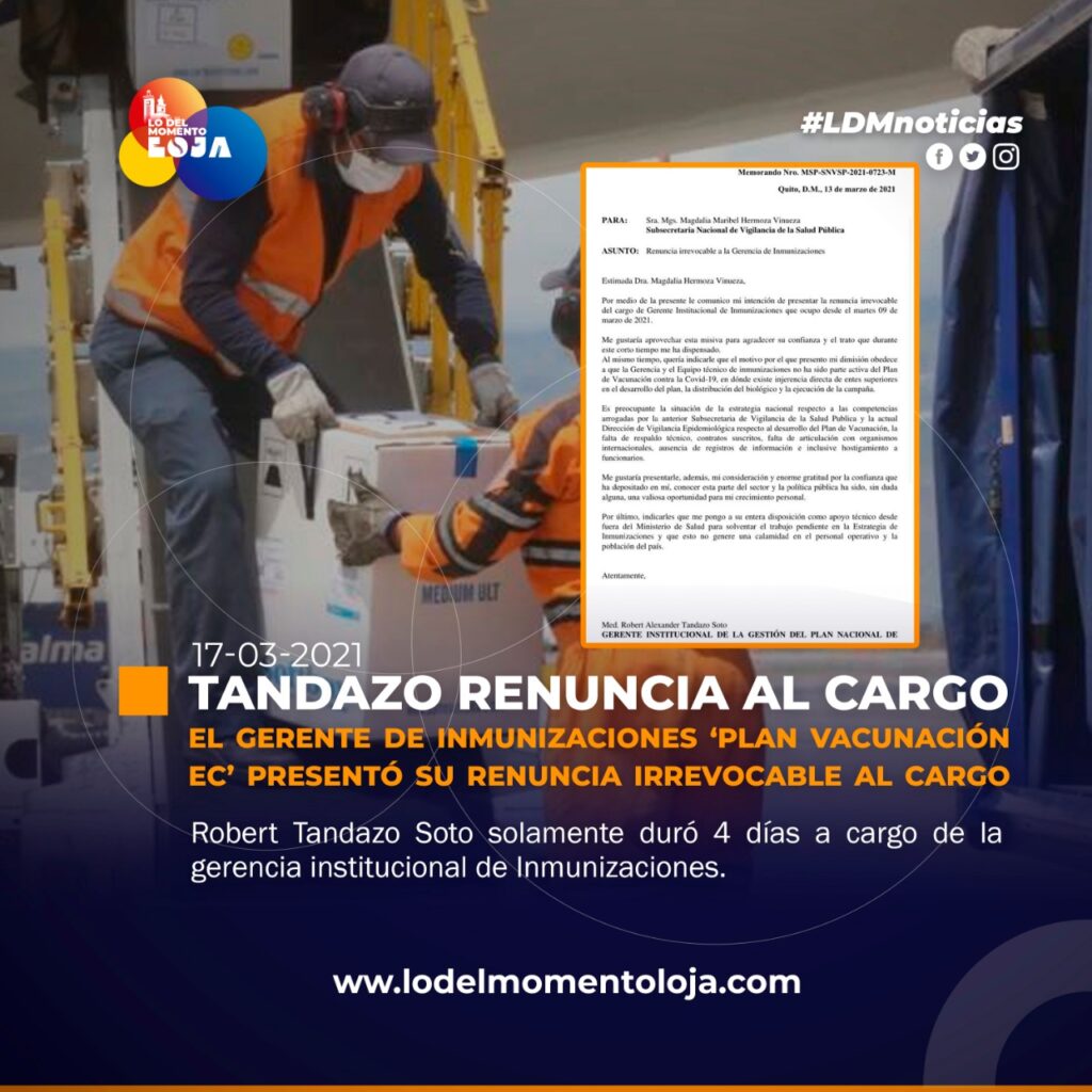 Tandazo, justifica su renuncia por la falta de apoyó y atención de la Gerencia y del Equipo Técnico de inmunizaciones del Plan Nacional de Vacunación “donde existe injerencia directa de ente superiores en el desarrollo del plan.” Denuncia que, desde mandos superiores deciden la distribución de las dosis de la vacuna y la ejecución del proceso de vacunación.