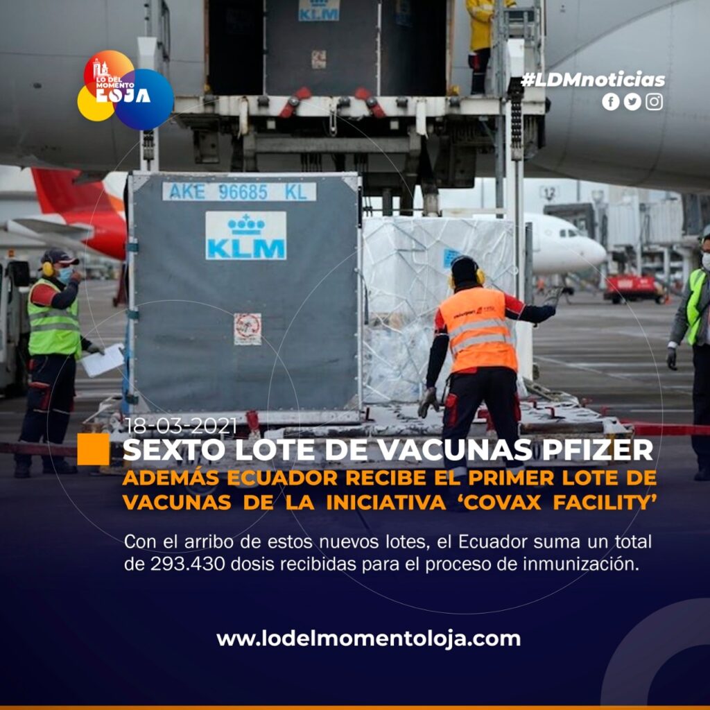 Según el cronograma del Laboratorio Pfizer, arribaron al aeropuerto internacional Mariscal Sucre de Quito, la sexta remesa de vacunas de esa farmacéutica, que contiene 62.010 dosis contra la COVID-19; y 84.000 dosis del primer lote de la vacuna de AstraZeneca, a través de la iniciativa Covax Facility, a fin de continuar la implementación de la Fase 1 del Plan Vacunarse.