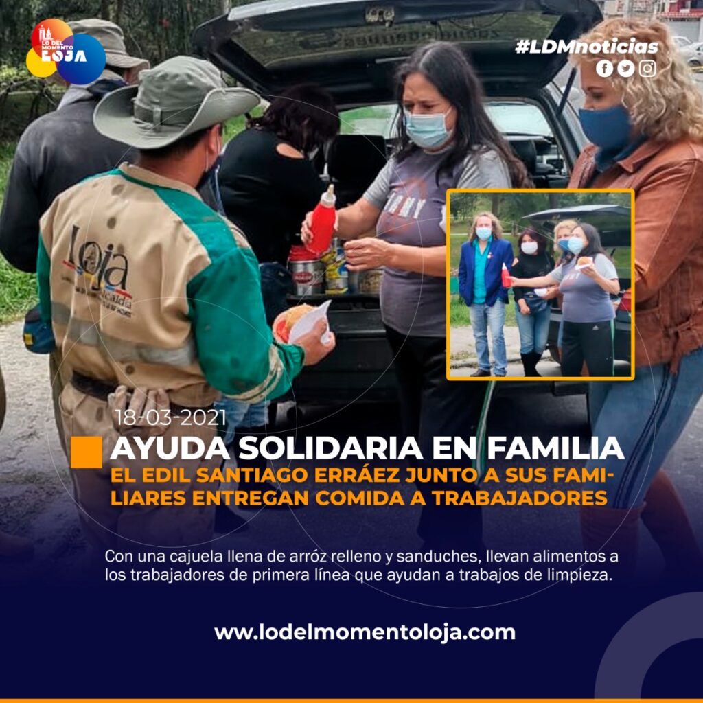 Otro de los que ha destacado con su labor social es el edil Santiago Erráez, ya que se reunió hace algunos días con sus familiares para organizar la preparación de arroz relleno y sanduches para entregarlos a los diferentes trabajadores de primera línea del Municipio de Loja que están en constante trabajos de limpieza debido a las fuertes lluvias que azotaron al cantón. Esta, es una de las tantas actividades que realiza Erráez, pues en tiempos de pandemia también se hacía presente.