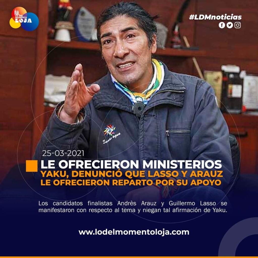 Mediante comunicado del Movimiento Pachakutik, el excandidato presidencial Yaku Pérez, denunció en la asamblea del Consejo Político que el candidato Guillermo Lasso le ofreció 5 ministerios a cambio de los votos de Pachakutik, mientras que Andrés Arauz ofreció un alto cargo para co-gobernar y financiar con millones de dólares el voto nulo, o que causa curiosidad y confirma su comportamiento corrupto.