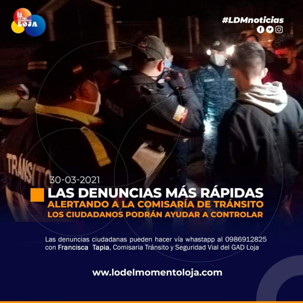 Tras el pedido de los ciudadanos para notificar las diferentes indisciplinas que se dan en esta temporada de la pandemia, Abg. Francisca Tapia, Comisaria de Tránsito y Seguridad Vial del Municipio de Loja, ha puesto en consideración su contacto de whastapp para que puedan realizar sus denuncias de forma anónima.