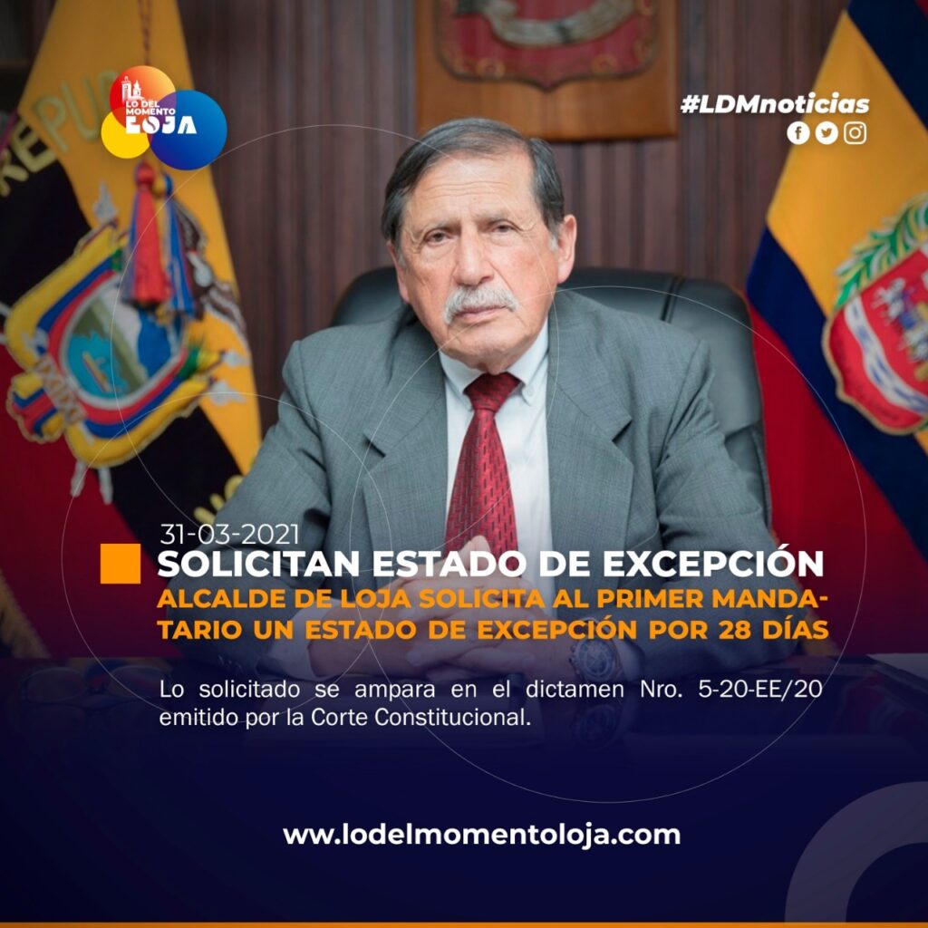 El alcalde de Loja y presidente del COE Cantonal, Ing. Jorge Bailón, solicitó al Presidente de la República Lenín Moreno la emisión de un decreto para dictar estado de excepción en esta jurisdicción, por un tiempo de 28 días.