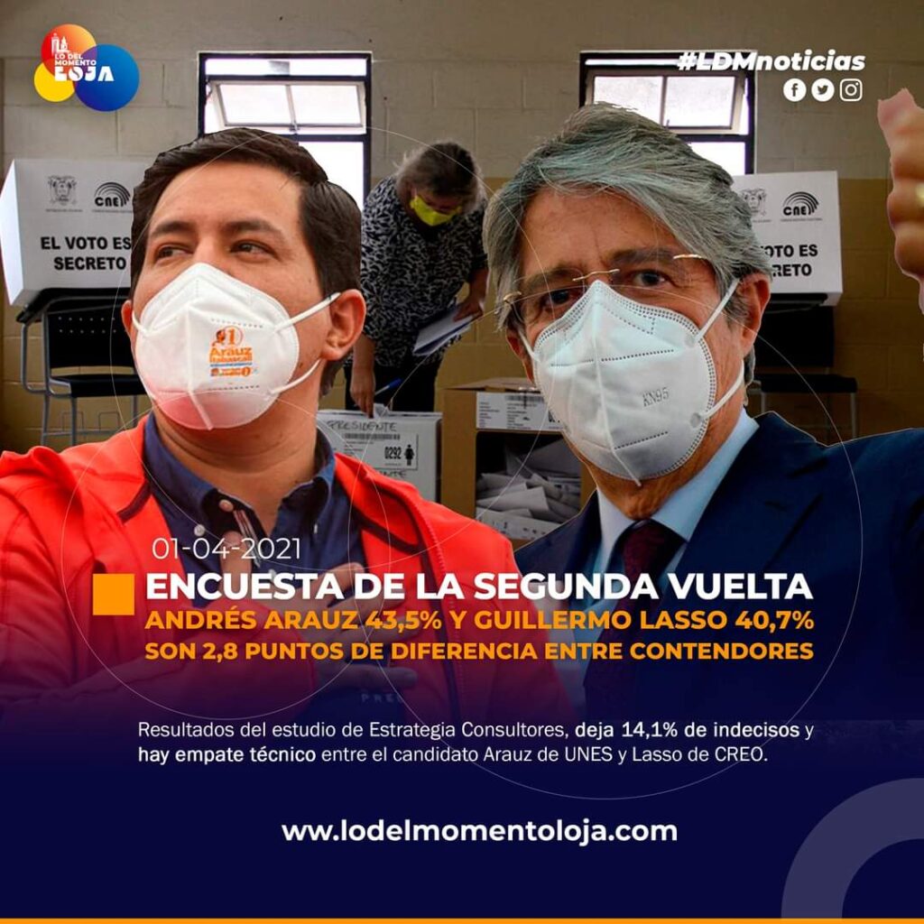 La empresa Estrategia Consultores de Carlos Granda, es una de las encuestadoras con mayor credibilidad en la provincia de Loja por los diferentes aciertos que ha tenido en los últimos años, esta consultora ha realizado un sondeo de la opinión pública mediante encuesta a 16 provincia del Ecuador con un corte hasta el 28 de marzo del 2021 y ha dejado como resultados una diferencia de 2,8% entre los candidatos finalistas Andrés Arauz y Guillermo Lasso, es decir un empate técnico y con una indecisión existente que podría variar hasta el día de las elecciones.