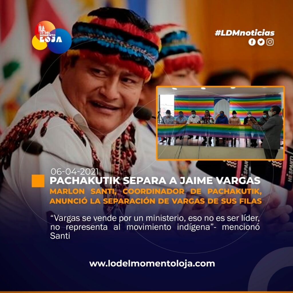 “La decisión de Jaime Vargas no representa la decisión de Pachakutik”, afirmó Santi y contó que el consejo político decidió expulsarlo del partido, aunque tiene todavía derecho a defenderse ante la comisión de ética. Además añadió “Jaime Vargas se vendió por un Ministerio en una reunión en un hotel de Orellana”.