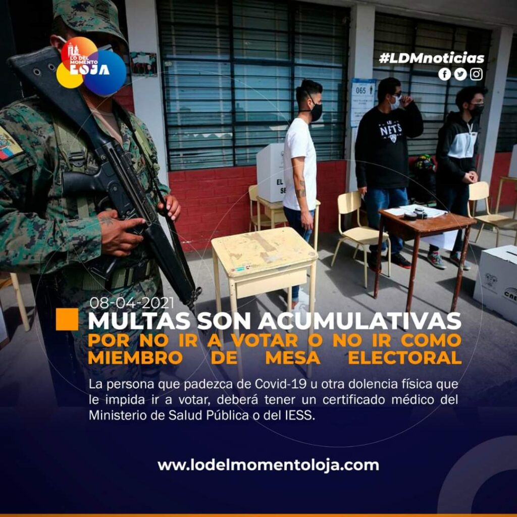 Este domingo, 11 de abril, se realizará la segunda vuelta de las elecciones en Ecuador, quienes no asistan a las urnas, teniendo la obligación de hacerlo, deberán presentar una justificación válida o serán sancionados con una multa de $ 40, equivalente al 10% del Salario Básico Unificado de $ 400, según lo indica el Código de la Democracia.