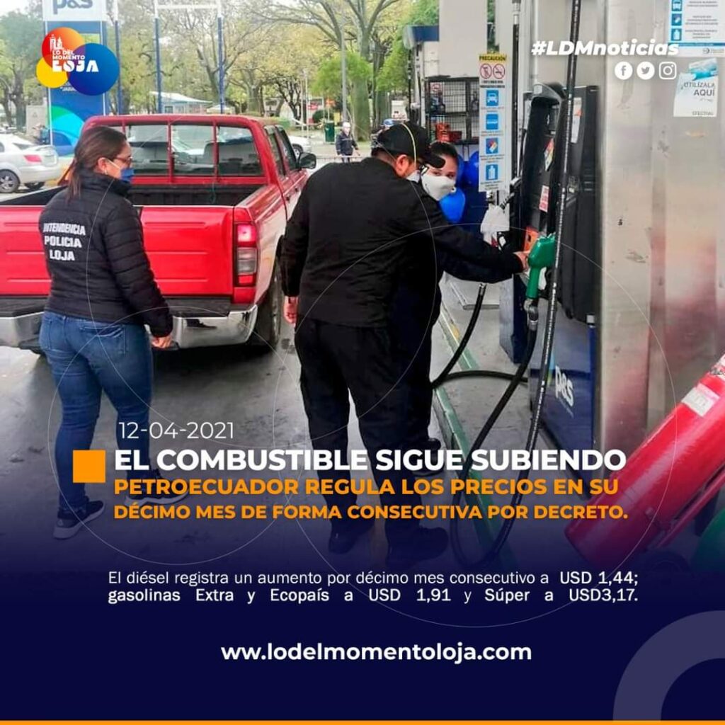 Por décimo mes consecutivo, el precio del diésel que se emplea en el sector automotriz se incrementa en Ecuador; ahora, su valor será de USD 1,40 a 1,44. De la misma manera, la gasolina extra o ecopaís aumentará de USD 1,83 a USD 1,91 y y la gasolina súper, cuyo precio está liberalizado, se incrementó hasta USD 3,17 por galón.