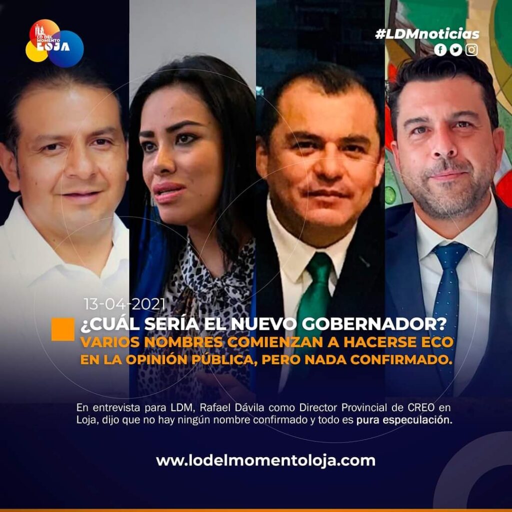 Pese al pronunciamiento del Ing. Rafael Dávila como Director Provincial de CREO en Loja sobre este eco del próximo Gobernador de Loja, ha ratificado de manera contundente que solo es una especulación y que no hay ningún nombre, ya que eso lo decidirán el Ministro que se posicione en el Gobierno de Lasso.