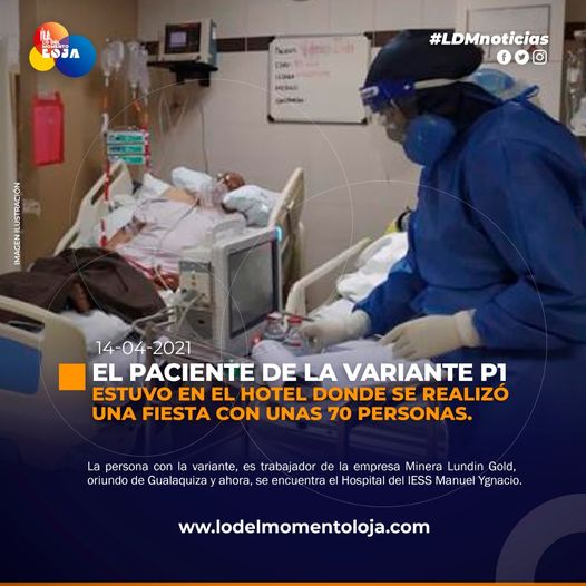 #Loja | Dr. Alfredo Vera, Coordinador zonal 7 de Salud, mencionó que el paciente p1 de la variante brasileña de coronavirus, cumplía aislamiento en un hotel 5 estrellas de la ciudad; en este mismo lugar se realizó una fiesta entre la noche del 19 y madrugada del 20 de marzo con aproximadamente 70 personas, cabe indicar que el ciudadano no participó de la misma. Por precaución las autoridades de salud se encuentran realizando las respectivas investigaciones para establecer el cerco epidemiológico.