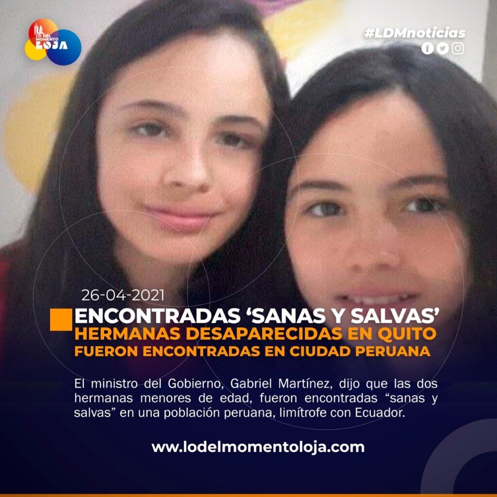 Dos hermanas, menores de edad, Sofía Antonela y Sara Lucía Ovideo Quintana que habían desaparecido de Quito el 22 de abril, fueron encontradas “sanas y salvas” en la ciudad peruana de Piura, informó el lunes 26 de abril el ministro de Gobierno, Gabriel Martínez.