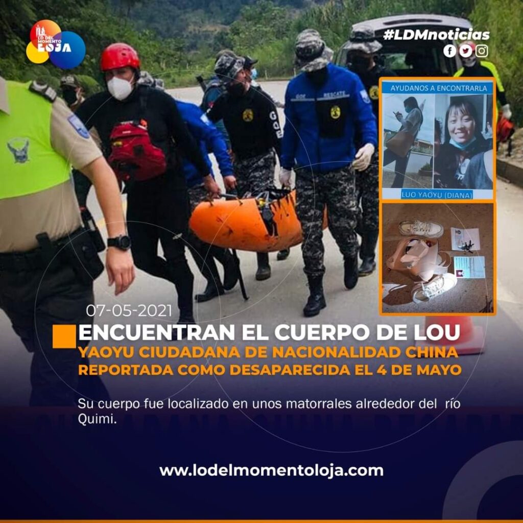 #ZamoraChinchipe | Personal de Bomberos El Pangui, Bomberos de Gualaquiza, DINASED, Policía Judicial realizaron levantamiento y evacuación del cadáver de la señorita LOU YAOYU de Nacionalidad China de 22 años de edad, misma que fue reportada como desaparecida el 4 de mayo del 2021.