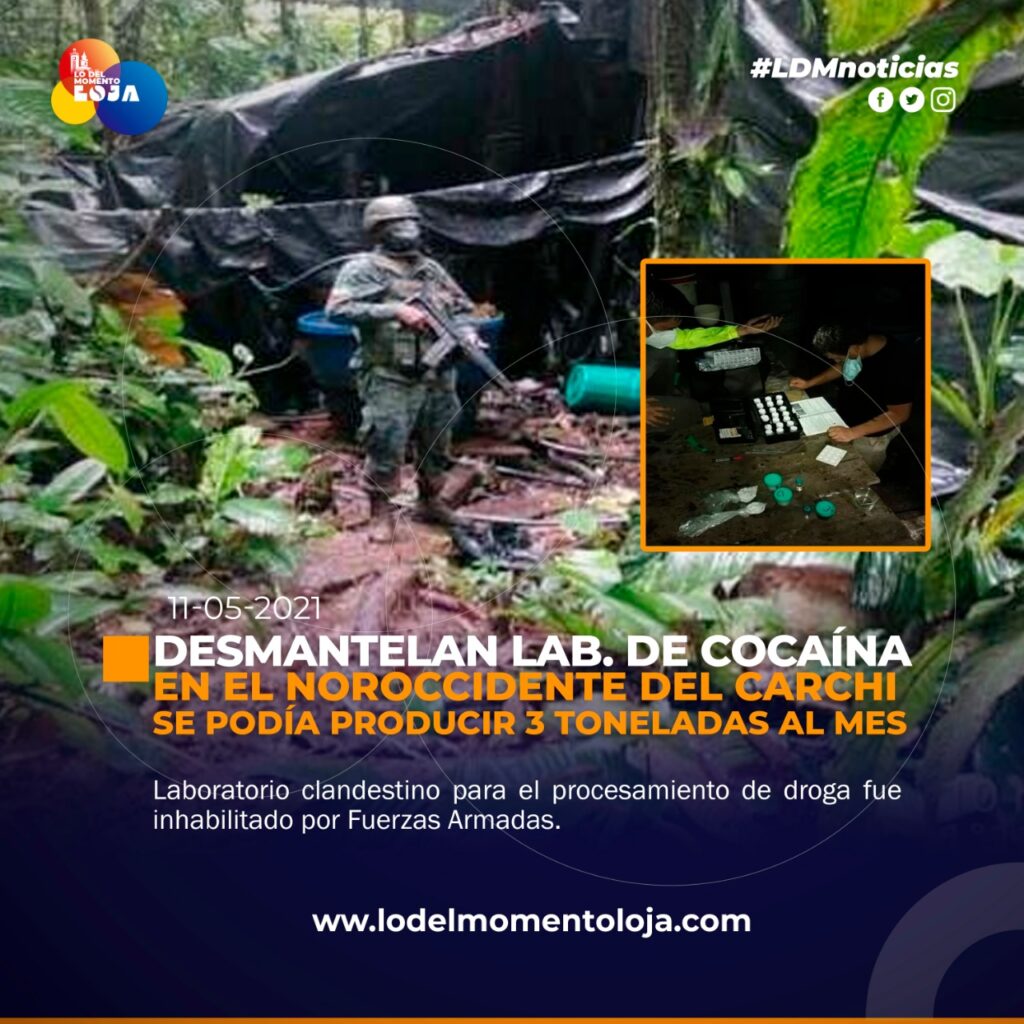 Un laboratorio clandestino para el procesamiento de droga, que operaba en el noroccidente de la provincia del Carchi, fue inhabilitado por personal de las Fuerzas Armadas. Una patrulla militar del Grupo Operacional 1.4 Esmeraldas descubrió las instalaciones, el 10 de mayo del 2021, en la parroquia Tobar Donoso.