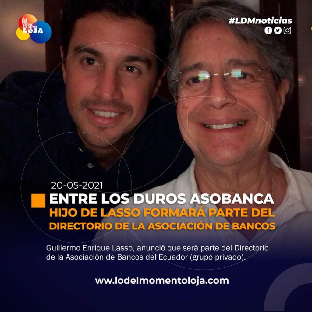 Guillermo Enrique Lasso Alcívar, hijo del presidente electo Guillermo Lasso, es el nuevo integrante del Directorio de la Asociación de Bancos Privados del Ecuador (Asobanca)