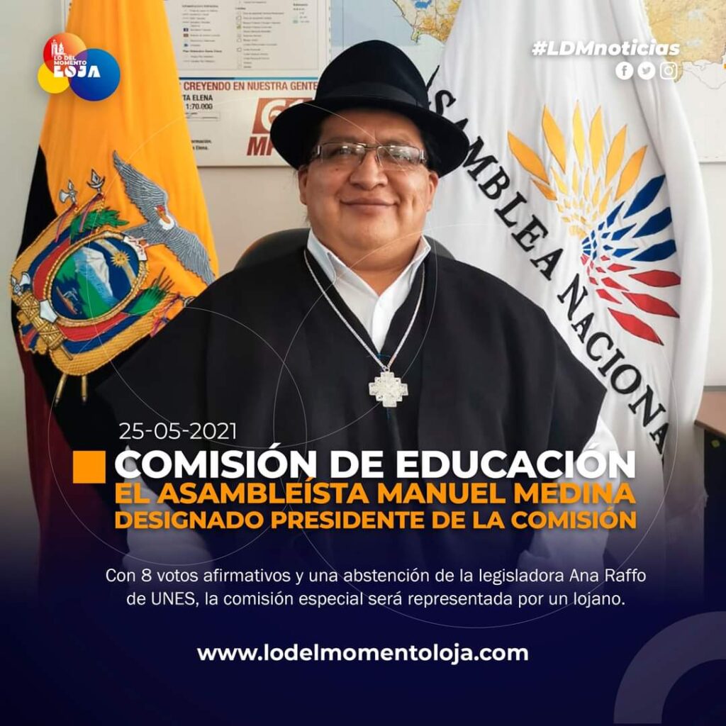 El asambleísta lojano Manuel Medina (de Pachakutik), con 8 votos afirmativos y una abstención de la legisladora Ana Raffo (UNES), ha sido designado Presidente de la Comisión Especial de Educación de la Asamblea Nacional para el período 2021-2023.