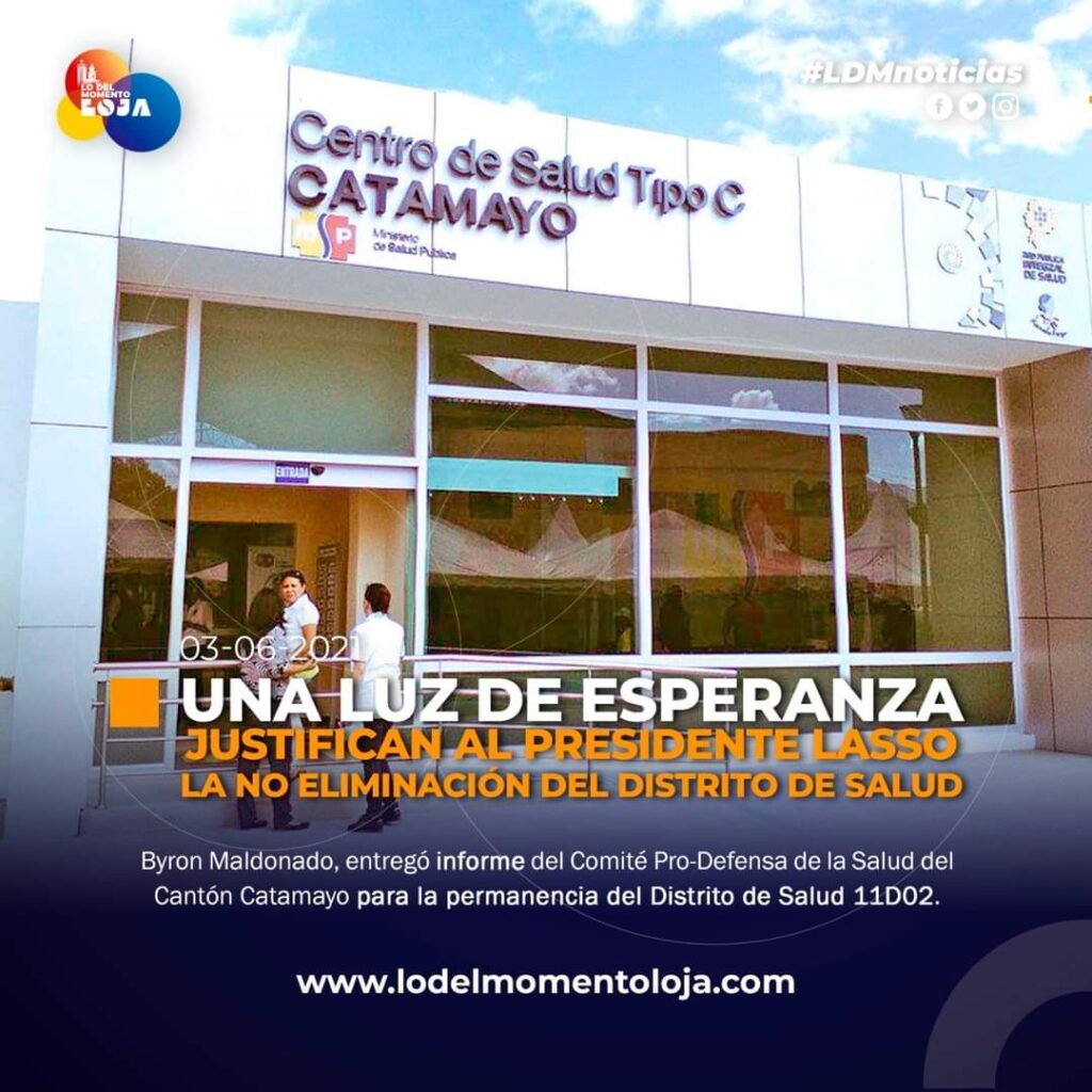 A pocos días de haberse posesionado como Asambleísta de la provincia de Loja, el Ing. Byron Maldonado ha iniciado las gestiones para que el Presidente de la República y la Ministra de Salud puedan mantener el distrito de Salud 11DO2 Catamayo-Chaguarpamba-Olmedo; esto, tras los informes realizados por el Comité Pro-Defensa de la Salud de Catamayo donde sustentan lo importante y esencial de esta dirección distrital para el Cantón.