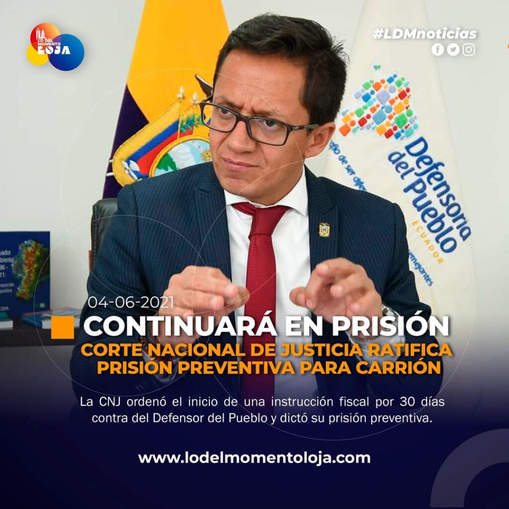 #Ecuador | El Tribunal de Apelación de la Corte Nacional de Justicia (CNJ) ratificó la prisión preventiva contra el defensor del pueblo, Freddy Carrión, detenido desde el 17 de mayo en la Cárcel 4, de Quito, mientras se le investiga por presunto abuso sexual.