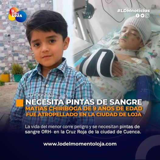 Matías es un niño de 9 años de edad que fue atropellado en Loja por un sujeto que se encontraba ingiriendo bebidas alcohólicas y tras este suceso, ahora la vida del menor corre peligro. Su familia pide ayuda para quienes se encuentren en Cuenca y puedan ayudar donando pintas de sangre ORH- en la Cruz Roja de ese cantón.