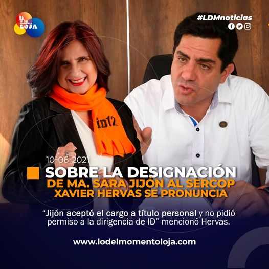 Ante la designación de Ma. Sara Jijón como Directora del SERCOP, el expresidenciable Xavier Hervas se pronunció tras la designación de su exbinomio, María Sara Jijón, y dijo que Jijón aceptó el cargo a título personal y no pidió permiso a la dirigencia del partido. “La Izquierda Democrática no está cogobernando”, aclaró.