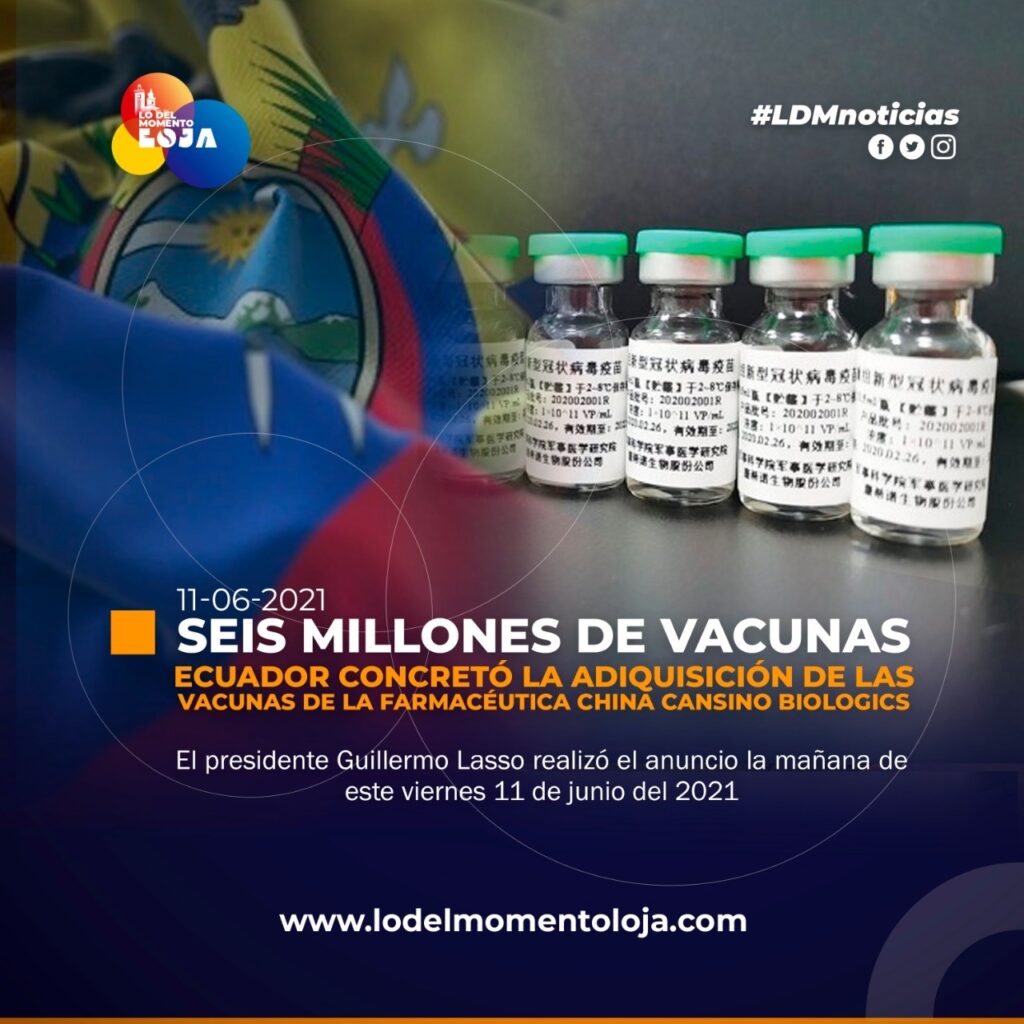 “Esta mañana les escribo con alegría y esperanza. Concretamos la adquisición de 6 millones de vacunas de CanSino”, escribió el Primer Mandatario, “con este cargamento se inmunizará a seis millones de habitantes, ya que solo se requiere una aplicación por persona (monodosis)” – añadió Lasso en el post.