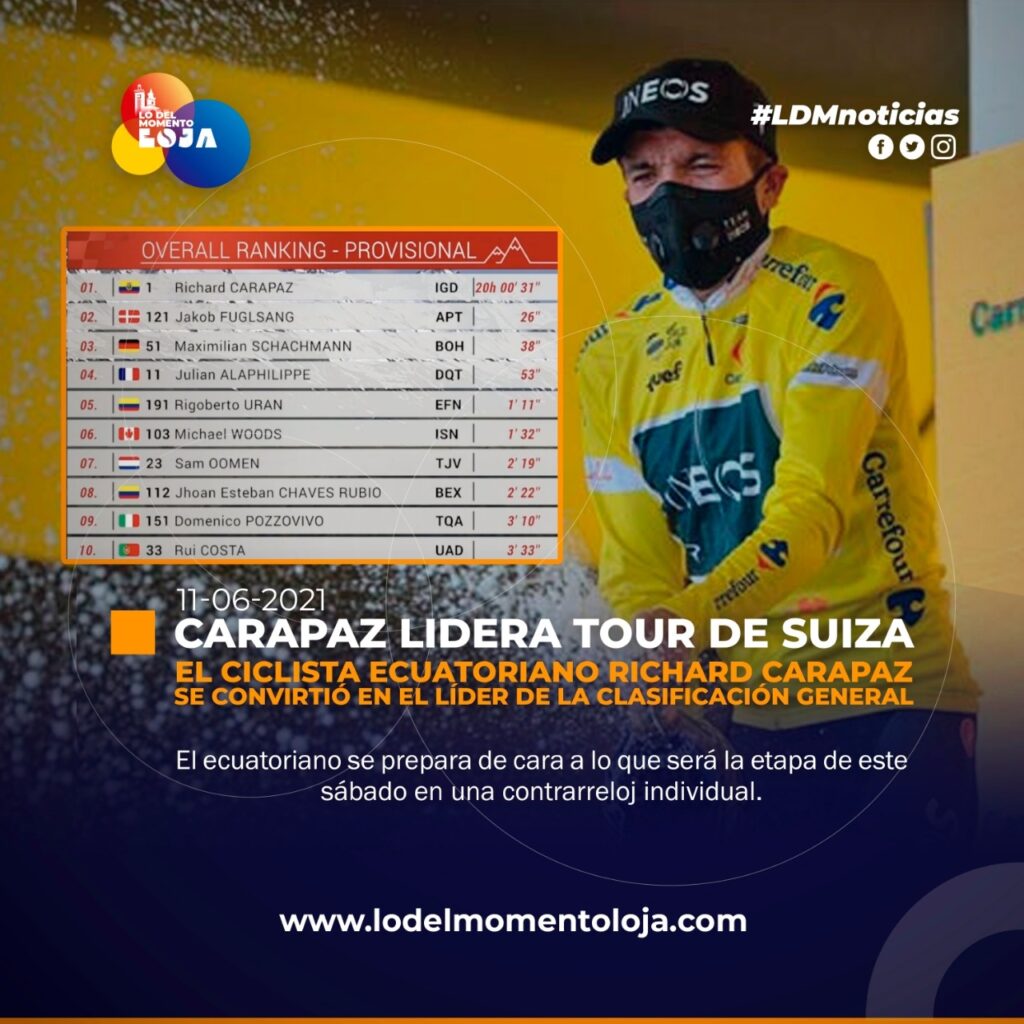 #Deportes | Richard Carapaz, de Ineos, ganó la quinta etapa del Tour de Suiza.