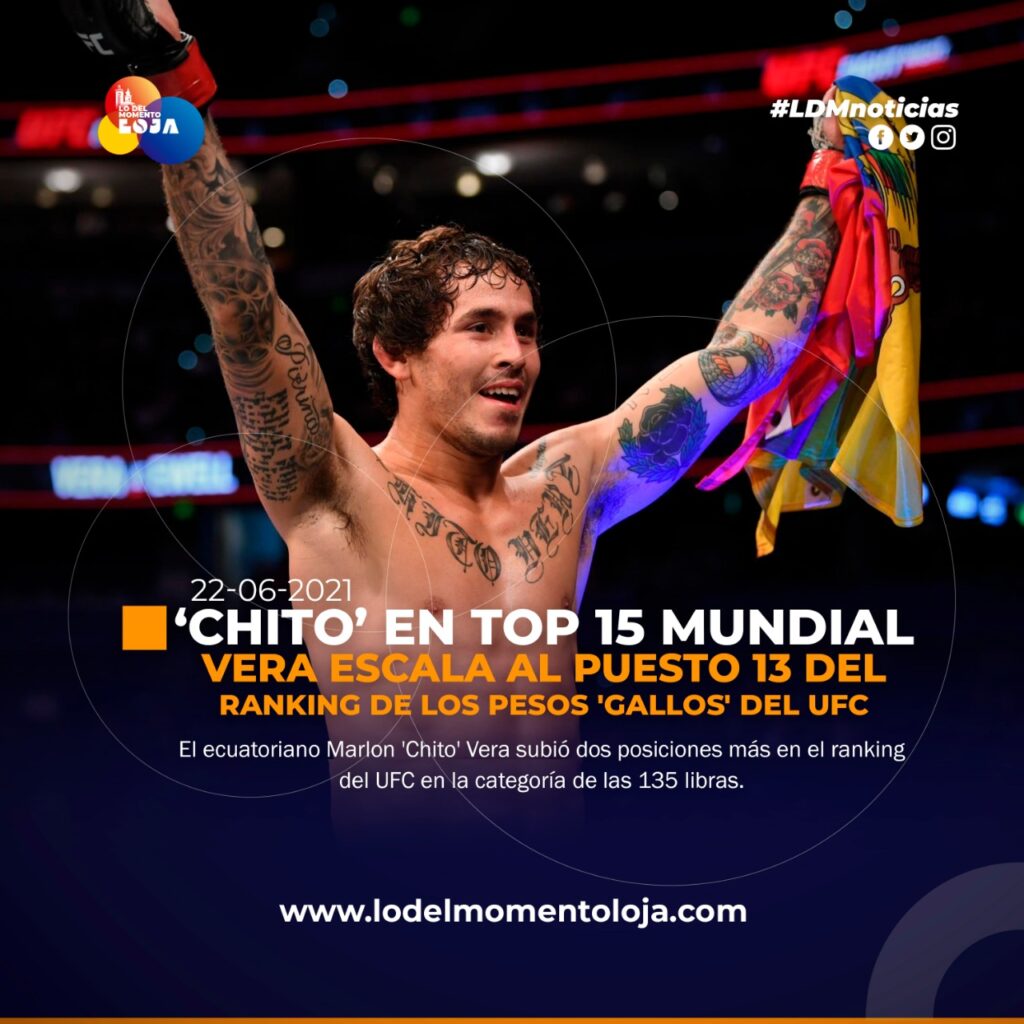 Marlon ‘Chito’ Vera escaló esta mañana en el ranking del UFC luego de su reciente actualización, donde aparece el peleador ecuatoriano ahora en el puesto 13 en la categoría de las 135 libras.