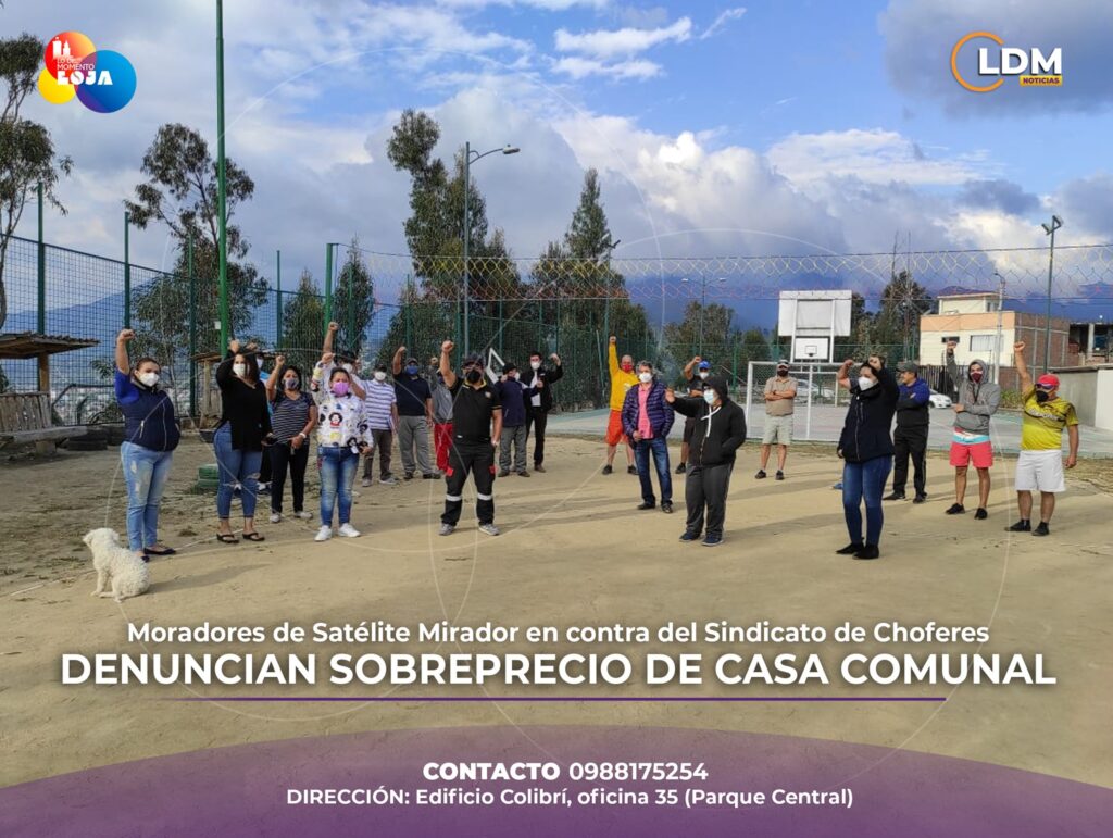 Los moradores de la ciudadela Satélite Mirador se reunieron para denunciar públicamente la actuación del Ing. Oscar Muñoz Secretario del Sindicato de Choferes de Loja por la construcción de una casa comunal valorada en unos USD150.000 aproximadamente, a criterio de los moradores, con sobreprecio. En el sitio donde aspiran realizar esta construcción, eliminaría gran parte del área de juegos, cancha de ecuavoley y zonas verdes utilizadas por niños y adultos del barrio.