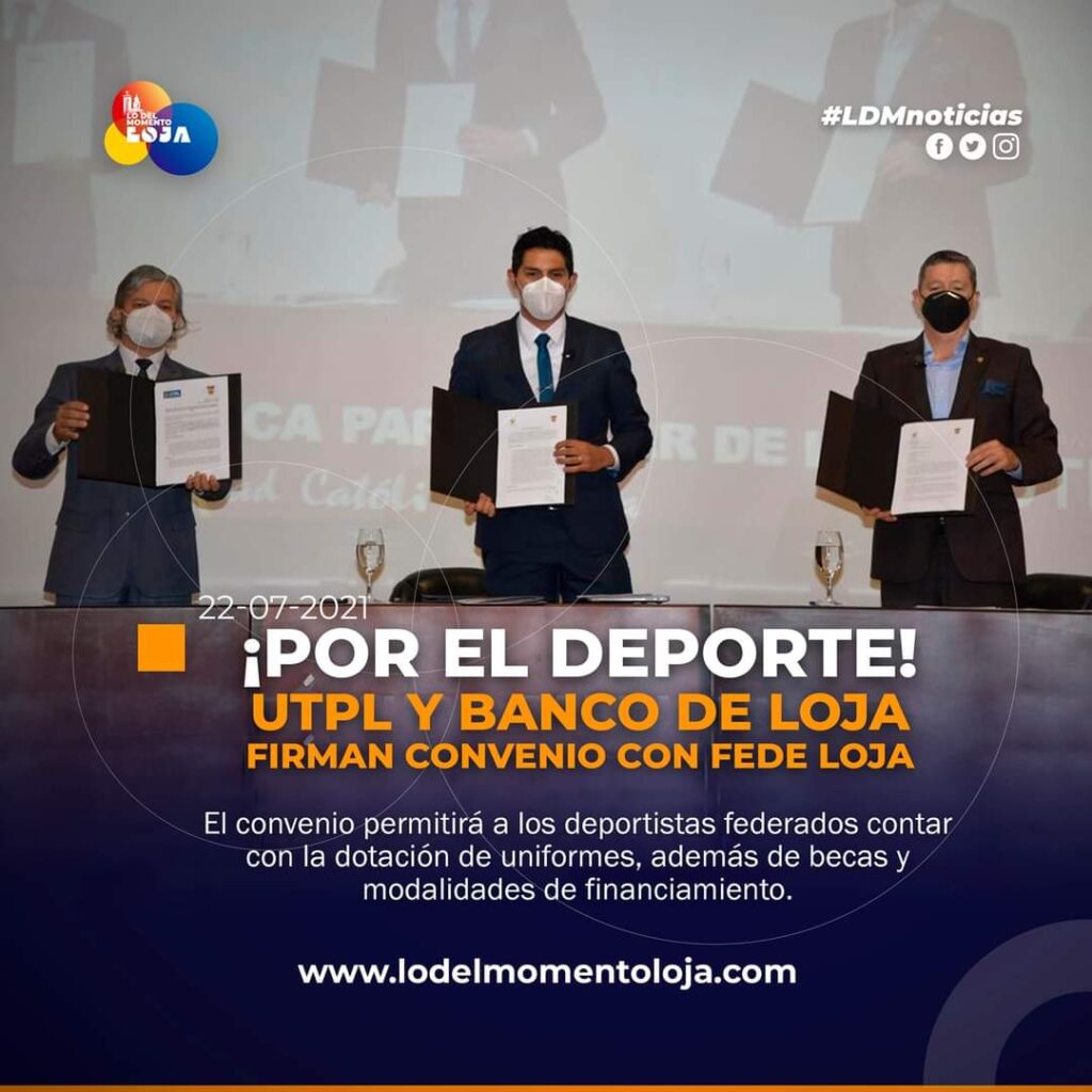 Un triple convenio de Cooperación Interinstitucional se realizó en el centro de convenciones de la universidad técnica entre Federación Deportiva de Loja, UTPL y Banco de Loja, con la finalidad de consolidar el apoyo al deporte de la provincia de Loja.