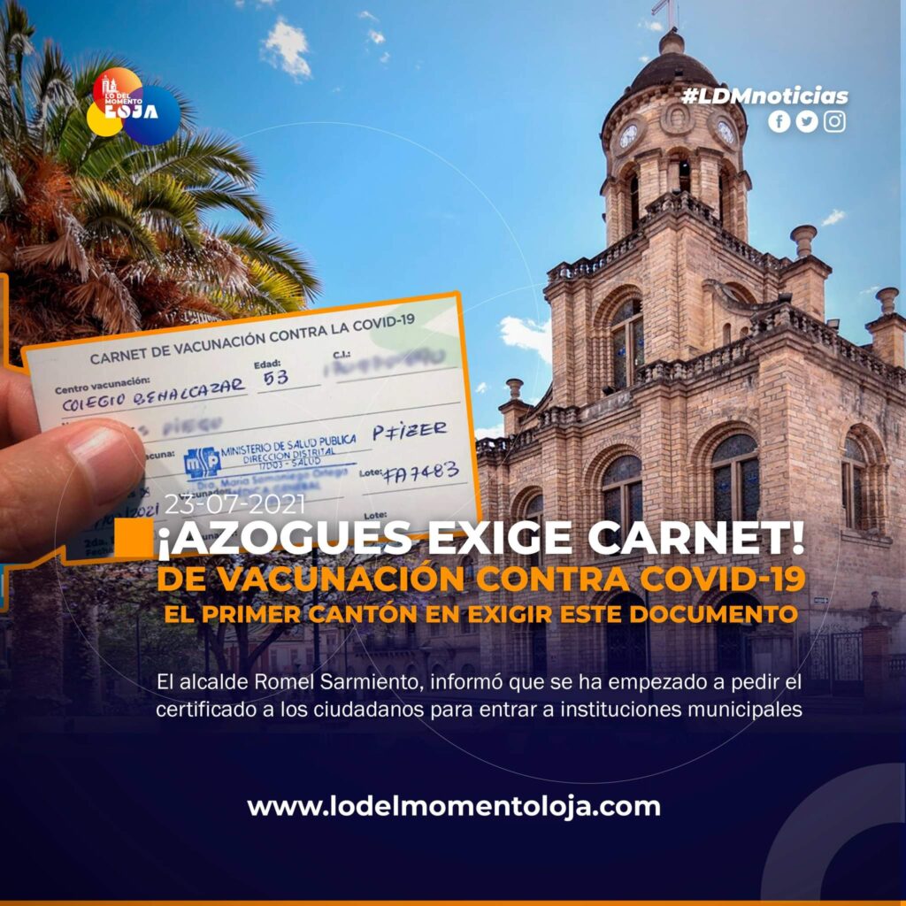 El carnet de vacunación ahora es un documento indispensable para ingresar para ingresar a establecimientos municipales del cantón Azogues, dicha localidad se convierte en la primera ciudad del país en exigir el carnet de vacunación con primera o segunda dosis contra COVID-19.