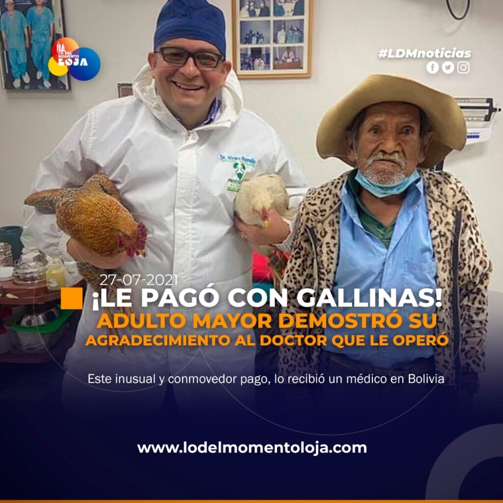 Un inusual y conmovedor pago, recibió un médico que operó de la próstata a un humilde abuelito en Bolivia, dos gallinas. Pese a que el cirujano le insistió que no debía cancelar nada por el procedimiento, el paciente insistió en quedar a paz y salvo por el servicio.