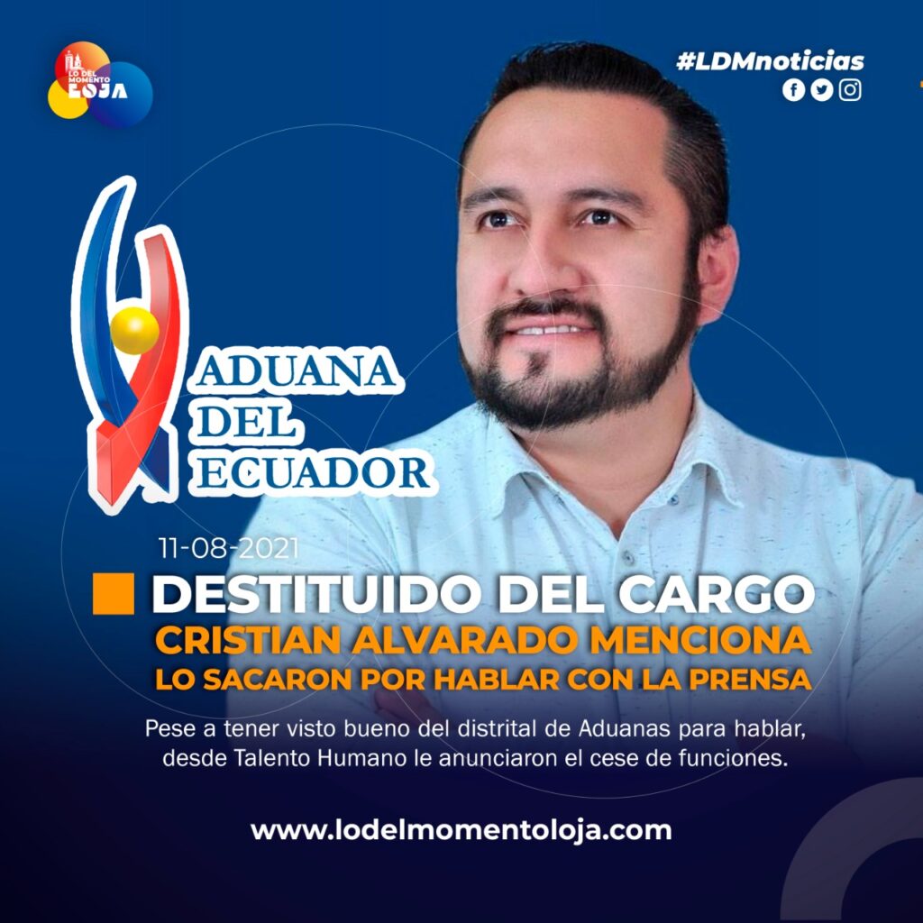 Cristian Alvarado, candidato a la asamblea por CREO, fue posesionado como Director de Despacho Zona Primaria del Servicio Nacional de Aduanas del Ecuador (Senae) el pasado 1 de julio del 2021; y hoy, a poco más de un mes de estar en el cargo ha sido cesado de sus funciones