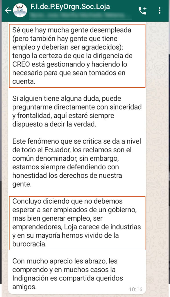 CHAT de diferentes grupos de apoyo a CREO Loja.