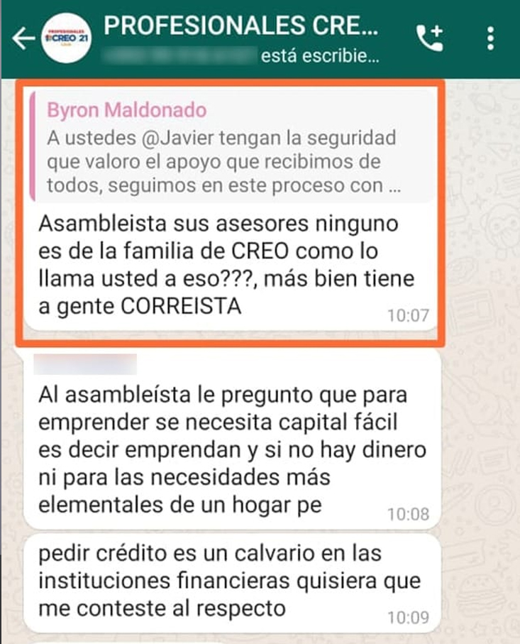 Por otro lado, en los grupos de chats de WhatsApp de la militancia de CREO en Loja, donde el asambleísta es miembro activo; la militancia ha rechazado la designación de la familiar del legislador, debido a que muchos militantes no han sido tomados en cuenta en el nuevo gobierno del “Encuentro”. Maldonado, se justifica aduciendo que “no debemos esperar a ser empleados de un gobierno, más bien generar empleo, ser emprendedores, Loja carece de industrias y en su mayoría hemos vivido en la burocracia”, concluyó en un mensaje de respuesta a los militantes de CREO Loja. Así mismo, ha sido criticado por los suyos porque el equipo de asesores que lo acompañan en la Asamblea Nacional, ninguno pertenece al Movimiento CREO.