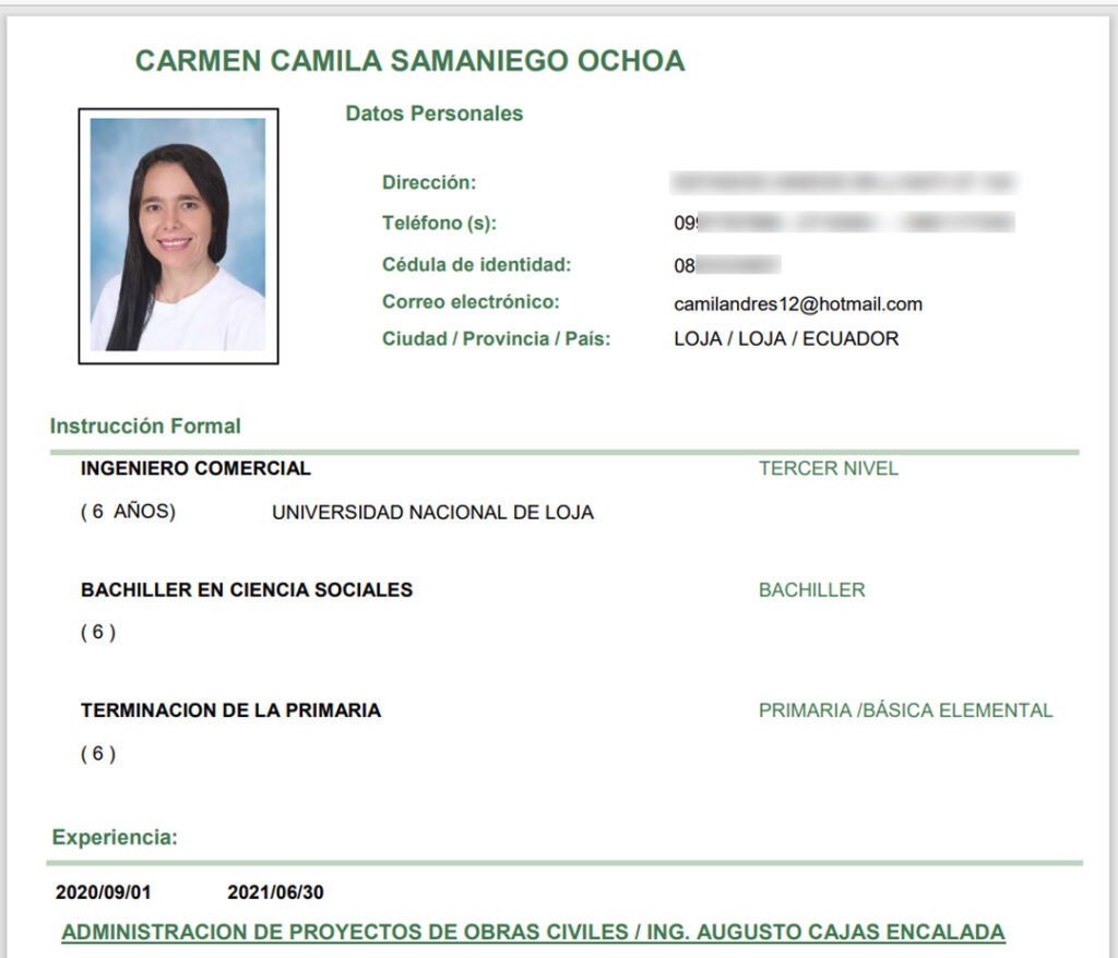 Su currículo fue proporcionado por el equipo de comunicación nacional de BanEcuador; Camila Samaniego, no posee ninguna experiencia y capacitación en temas financieros para ejercer el nuevo cargo, pero, si pone como referencia personal al actual Asambleísta de la Provincia de Loja, Byron Maldonado.