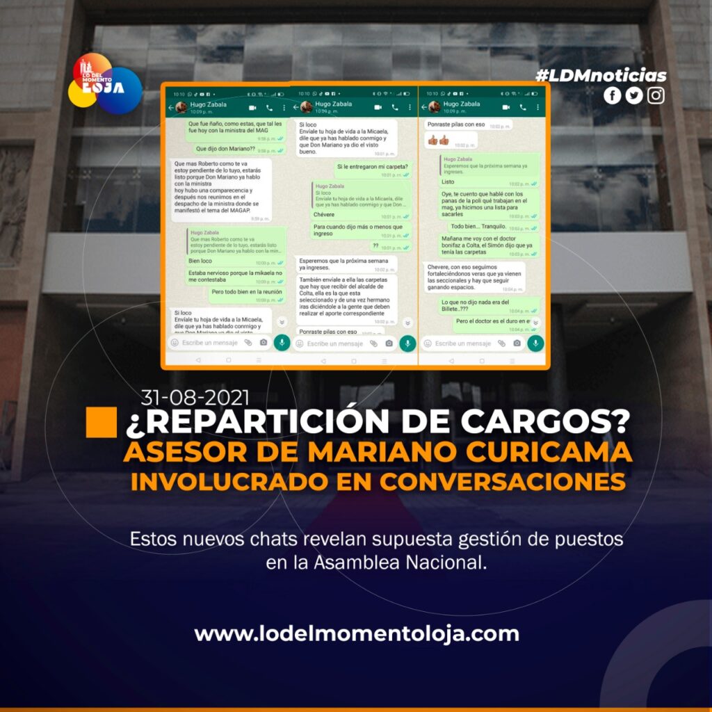 Según el medio digital Tiempo Real, reveló chat de Hugo Zabala, mano derecha del Asambleísta de Chimborazo, Mariano Curicama. El intercambio de chats habría sido con el actual Director del Ministerio de Agricultura, Roberto Gusqui. A quién le habría ofrecido cargo de libre remoción a cambio de dinero, el mismo actualmente es Coordinador Zonal del Ministerio de Agricultura.