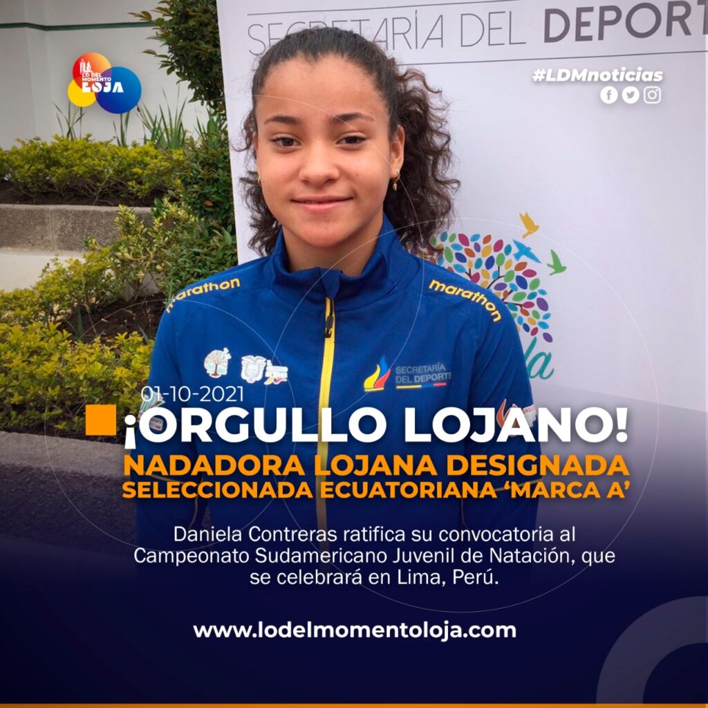 Daniela Contreras ratifica su convocatoria por parte de la Federación Ecuatoriana de Natación (FENA) al Campeonato Sudamericano Juvenil de Natación que se llevará a cabo en Lima, Perú, del 07 al 14 de Noviembre del presente año.