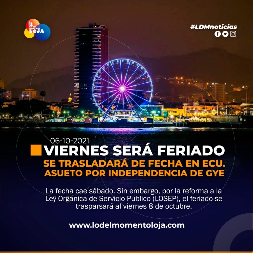 La fecha cae sábado. Sin embargo, por la reforma a la Ley Orgánica de Servicio Público (LOSEP), el feriado se trasparsará al viernes 8 de octubre.