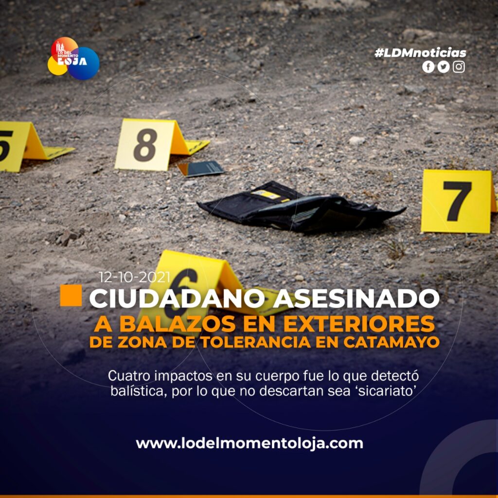 Un hombre de aproximadamente 50 años de edad fue asesinado a balazos en los exteriores de la zona de tolerancia de Catamayo, Loja. Autoridades no descartan que se trate de un presunto hecho de sicariato, tras encontrar varios impacto de bala en el cuerpo del occiso.