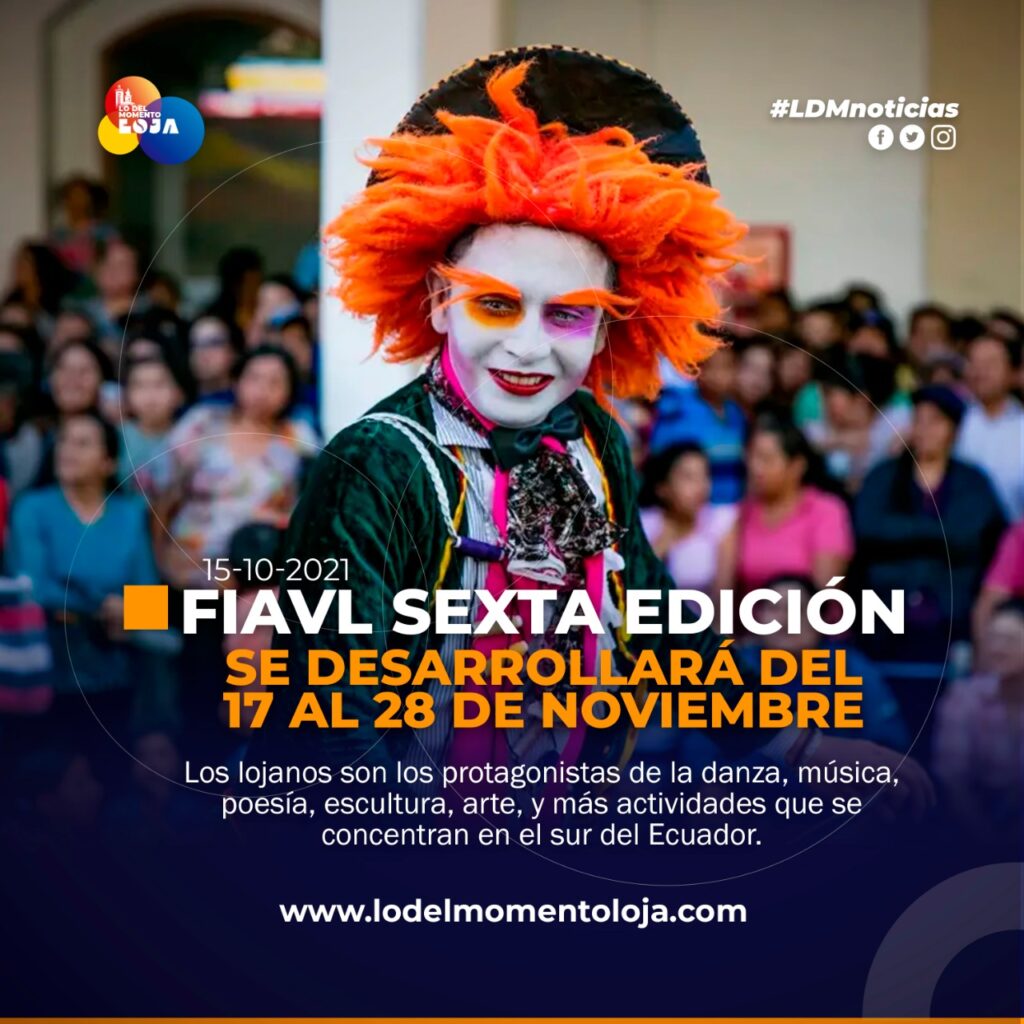 Festival Internacional de Artes Vivas de Loja (FIAVL), se desarrollará del 17 al 28 de noviembre de 2021, el tiempo y el espacio confluyen para crear una fiesta que atrae las miradas de todo el mundo. Artistas locales, nacionales e internacionales mostrarán su talento, ingenio y creatividad en Loja. Los lojanos son los protagonistas de la sexta edición del Festival Internacional de Artes Vivas que potenciará la identidad, dinamizará el turismo y la reactivación económica de la Centinela del Sur.