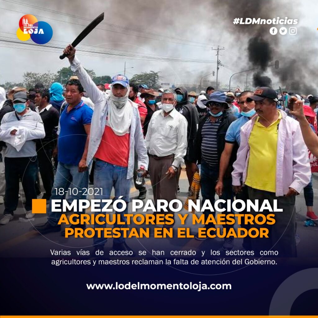 Gremios de agricultores, docentes agremiados a la UNE y más, se auto convocan al Paro Nacional que se lleva desde primeras horas de este 18 de octubre en todo el Ecuador, incluso ya se registran cierre de vías en varias partes del país. Estos reclaman la falta de atención del Gobierno, el alza de precio de los combustibles, afectación de derechos a la clase trabajadora, son las razones por la que se movilizan a las calles.